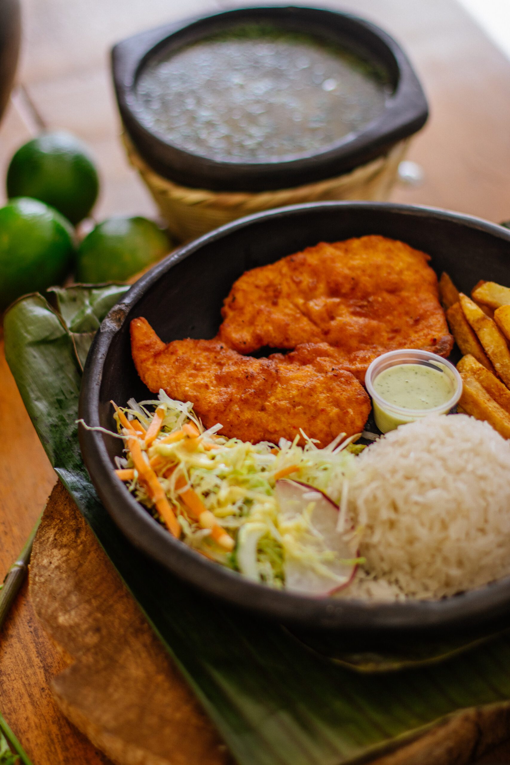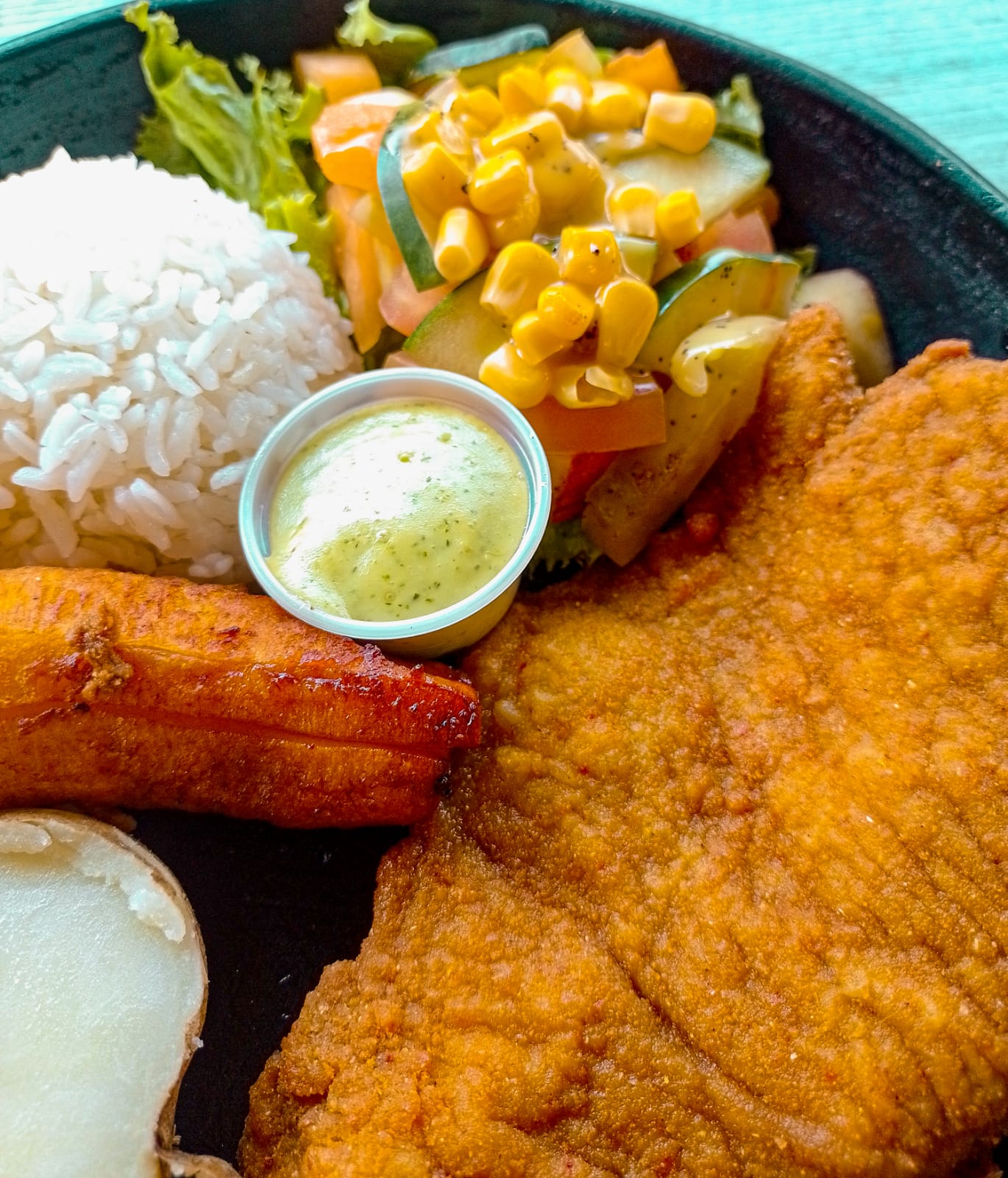 Puedes escoger de acompañante: papa criolla frita, croqueta de yuca o el