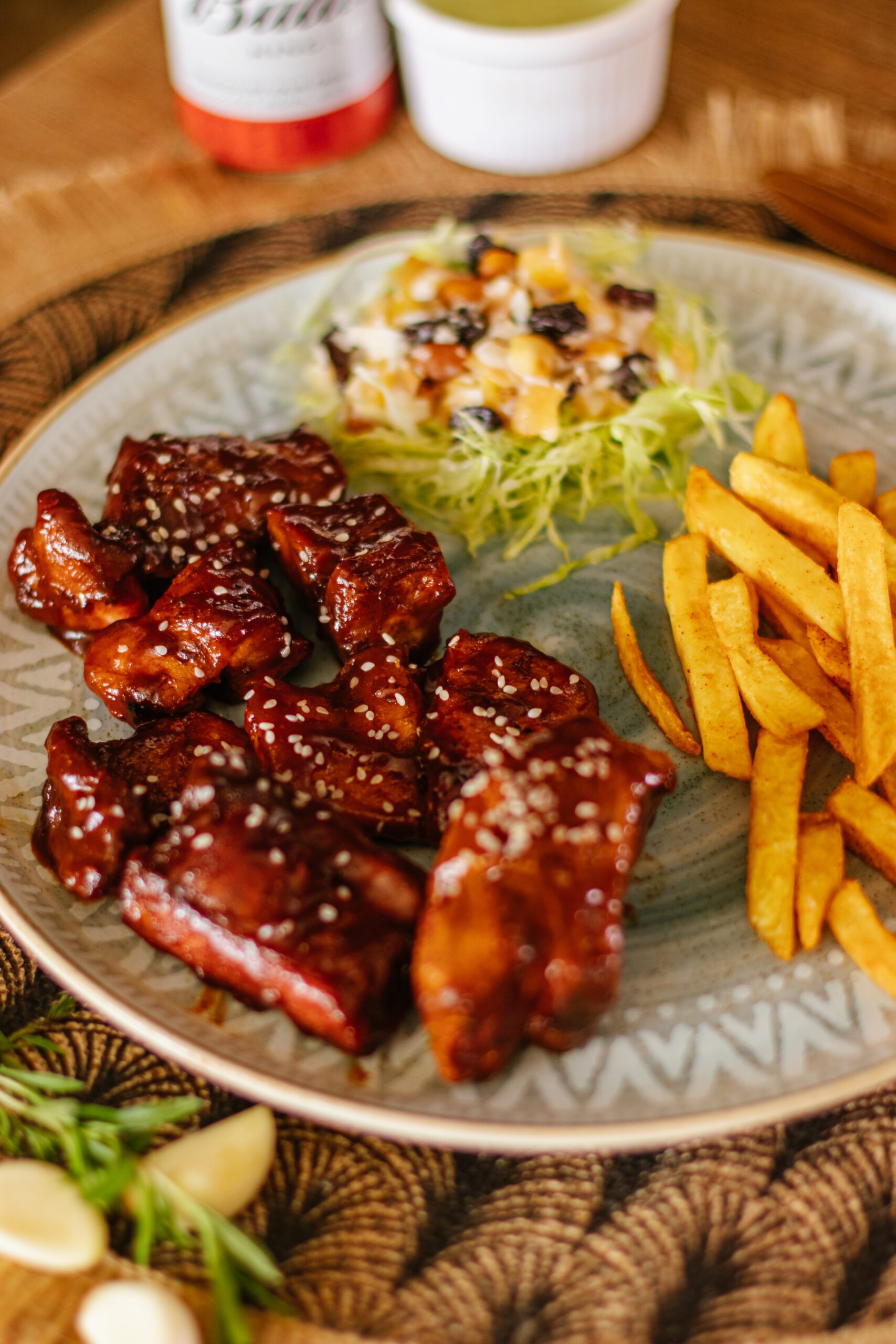 Costilla de cerdo en salsa BBQ, acompañada de papas a la francesa y ensalada dulce.