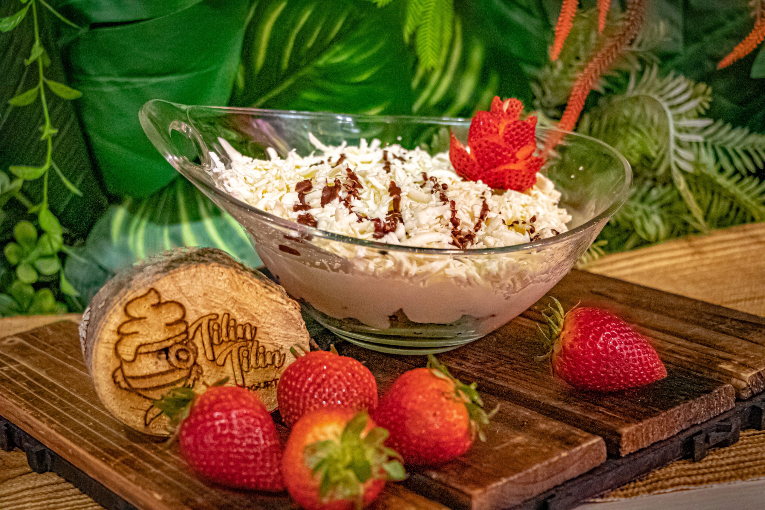 Fresas, crema de leche (receta de la casa), queso, galleta triturada y cobertura de chocolate.