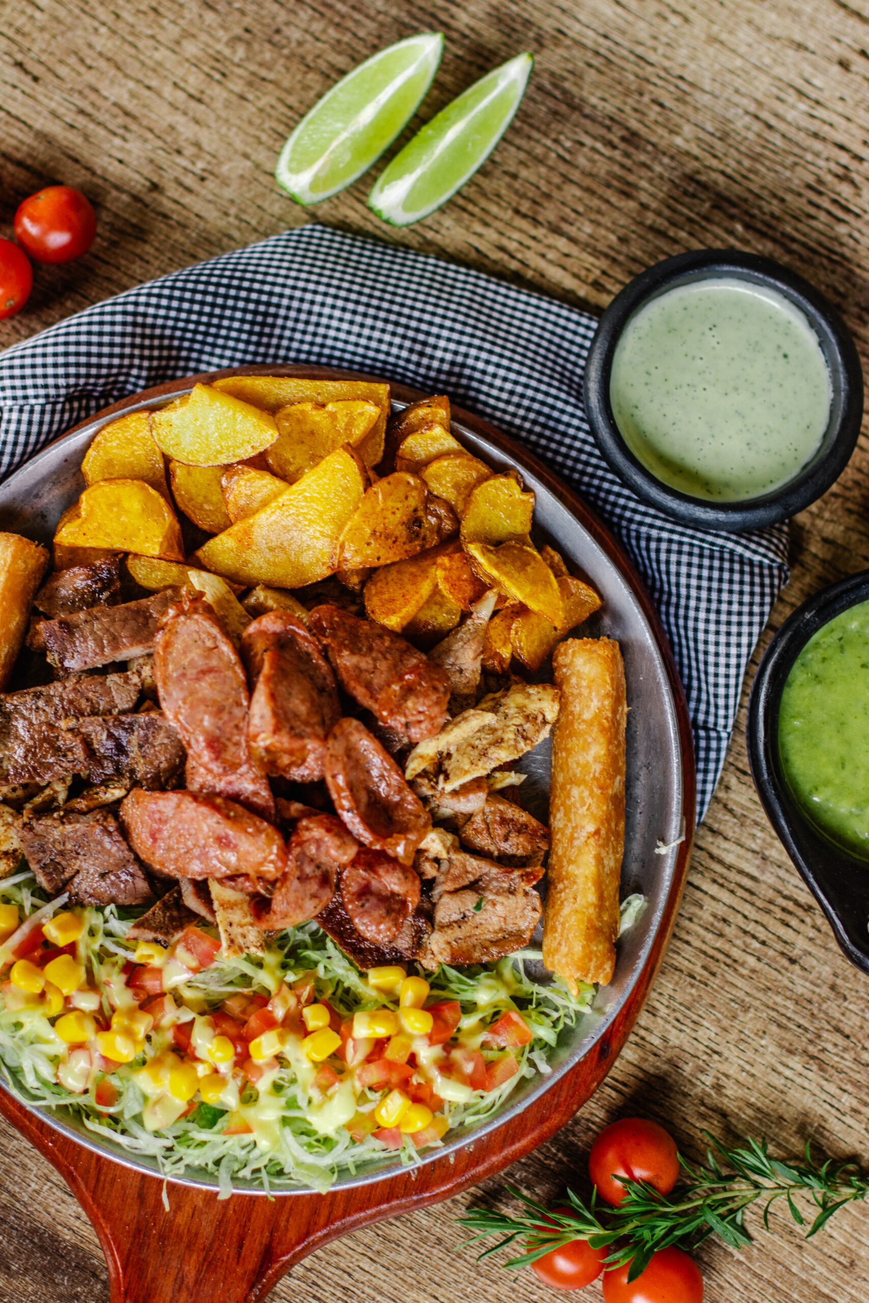 cerdo, pollo, chorizo, chicharrón, papa criolla, croqueta de yuca, tomate, salsa de la casa y chimichurri.
