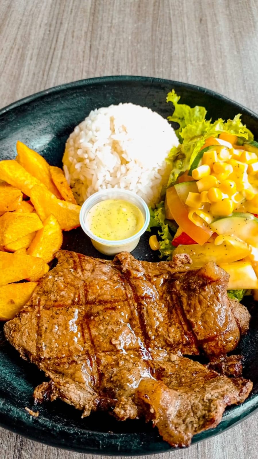 Almuerzo con carne a la parrilla de 100gr, acompañado de sopa de día, arroz, ensalada, acompañante, bebida y dulce.