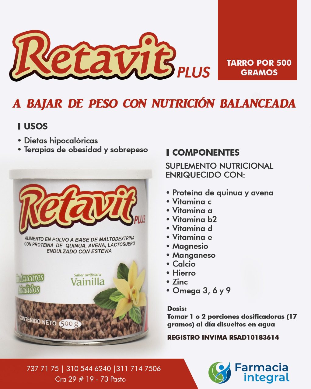 RETAVIT es un alimento en polvo a base de maltodextrina con proteina de quinua , aven, lactosuero endulzado con estevia. A bajar de peso con nutricion balanceada